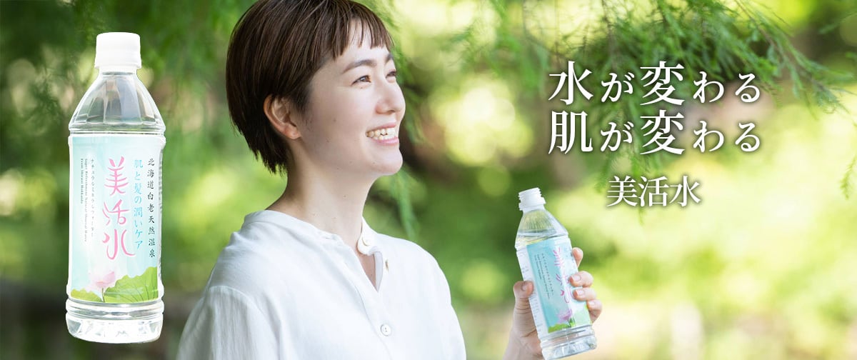 ◉美活水について 北海道遺産選定 モール温泉 硬度28mg/l(軟水)PH8.72 弱アルカリ天然水 弱アルカリ性の「美活水」は素早く体内に吸収され、 血液中の酸素を一定に保ち活性水素を作り出す働きを助けます。 北海道白老町にある白老温泉は、地下1,345mから 汲み上げる源泉「46.2℃」をそのまま掛け流しに している湯治場として人気の温泉地です。 そこから湧き出るお湯は、太古の植物が起源のモール温泉。 美肌の湯とも言われるモール温泉は入浴だけでなく飲用としても親しまれています。 「軟水」なのでのど越しが良く、また、シリカを含んだ水はまろやかで飲みやすいため、口に含んだときに「美味しい」という感覚につながっていきます。 美味しいお水を飲んで健康で美しく… ◉シリカとは・・・ 毛髪・爪・血管・関節等に含まれる、必須微量元素(二酸化ケイ素)のことです。人の免疫力に大きく影響し、特に肌の保湿やコラーゲンの再生・維持に大きな手助けをしています。 しかし体内で作ることができず、1日に10~40mgが消耗されます。 「美活水」にはこのシリカが75mg/リットル含まれており、老化・美肌の再生に大いに期待されています。 ◉美活水のヒミツ 北海道白老町にある白老温泉は、地下1,345mから汲み上げる源泉「46.2℃」をそのまま掛け流しにしている全国各地から人が集まる、湯治場としても人気の温泉地です。 「ナトリウム-塩化物・炭酸水素塩泉」という泉質の温泉で、本来人間が持つ自然治癒力を回復させてくれる効能があり、入浴だけではなく、飲用としても喜ばれています。病気の多くは、身体の酸性化だと言われています。普通のお水のほとんどがpH7前後の弱酸性か中性ですが「美活水」はpH8.72の弱アルカリ性のお水なので、素早く体内に吸収され、血液中の酸素を一定に保ち活性水素を作り出す働きを助けます。 お薬ではないので、飲んですぐ効くというわけではありません。少しずつ長く飲み続けていただくことをおすすめします。 ◉商品詳細 美活水 500ml 1ケース(24本入り) 1ケース(送料無料)¥4,800 2ケース(送料無料)¥9,160