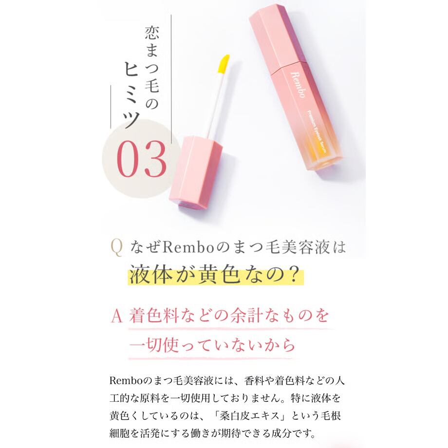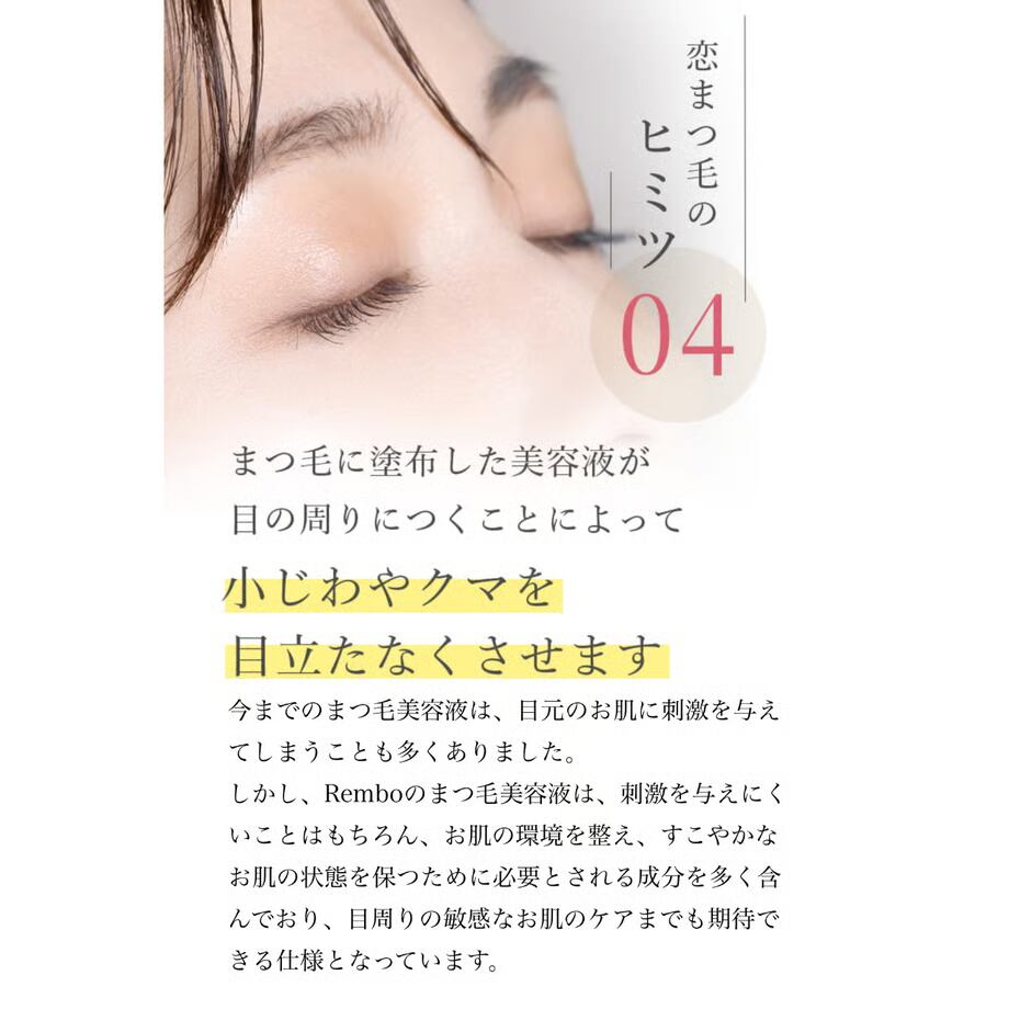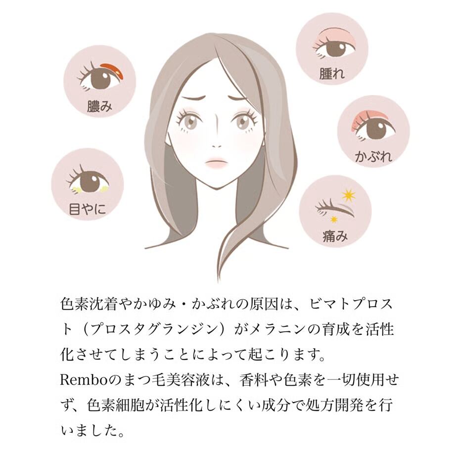 まつ毛をしっかりと伸ばすことはもちろん、色素沈着やまぶたの炎症、かゆみを抑えるよう処方されています。まつ毛の成長を促すために配合されたのが、桑白皮という珍しい成分。まつ毛の成長周期には「休止期」と「成長期」がありますが、この成分は休止期の毛を成長期へと切り替え、まつ毛の成長を促進する働きを持っています。また、バージョンアップという成分も配合されており、毛乳頭細胞に働きかけて発毛をサポート。これは頭皮のエッセンスにも使われる成分で、まつ毛の育成に優れた効果を発揮します。さらに、色素沈着を防ぐこともRembo プレミアム アイラッシュセラムの大きな特徴です。また、まぶたのケアに欠かせない成分として、**EGF(上皮成長因子)**を配合。これは細胞の分裂を促進し、肌のターンオーバーを正常化。加齢によるたるみ、肌の弾力アップ、水分保持などのエイジングケア効果を持つ高価な成分で、化粧品業界でも注目されています。まぶたに塗ることで、小じわやたるみを修復し、目元全体をより若々しく整えることができます。 つまり、Remboプレミアム アイラッシュセラムは、まつ毛を美しく育てるだけでなく、目元全体のスキンケアも兼ね備えています。まつ毛のボリュームアップと目元の美しさを両立させたい方に、おすすめの商品です。