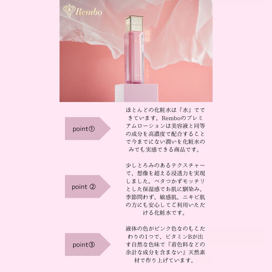 Rembo プレミアム ローションは、一般的な化粧水とは一線を画し、美容液レベルの成分を贅沢に配合したスキンケアアイテムです。